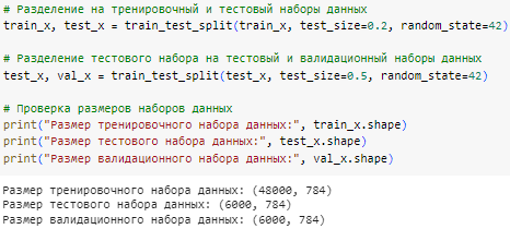 - Размеры тренировочного, валидационного и тестового датасетов: 48000, 6000 и 6000 соответственно