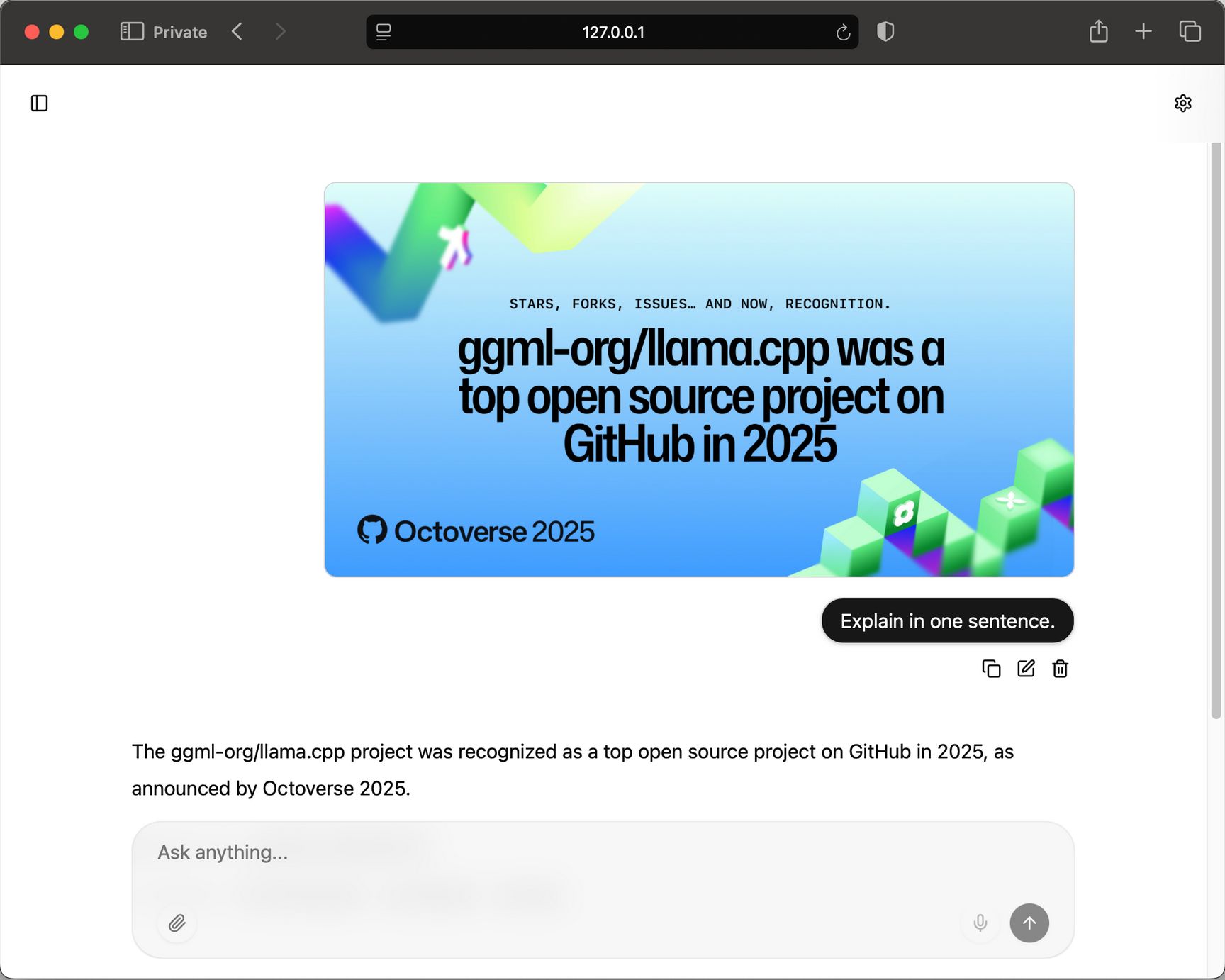 Personally, I look forward to recruiting more talented developers to join the team and contribute to llama.cpp. Last year, we recruited Aleksander Grygier because the Web UI project was getting a bit out of hand for me to manage alone. That was a great decision, as Aleksander has been doing an amazing job maintaining the Web UI and adding new features. The community loves him, and he's a great asset to the project.